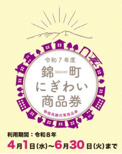 錦町では、国の物価高騰対応重点支援地方創生臨時交付金を活用し、町民生活の負担軽減及び地域経済の活性化を目的として「令和7年度物価高騰対策商品券事業(錦町にぎわい商品券)」を実施します。